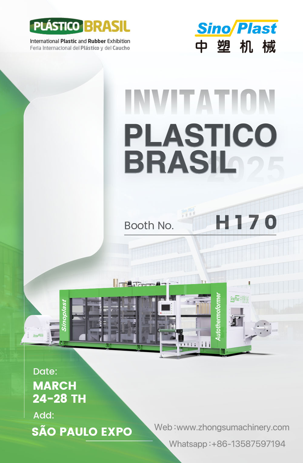 Sinoplast is excited to announce our participation in PLÁSTICO BRASIL 2025, the premier event for the plastic industry, taking place from March 24th to 28th. We warmly invite you to visit our booth H170, where we will showcase our latest innovations in thermoforming technology.